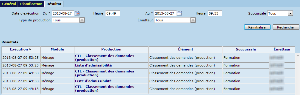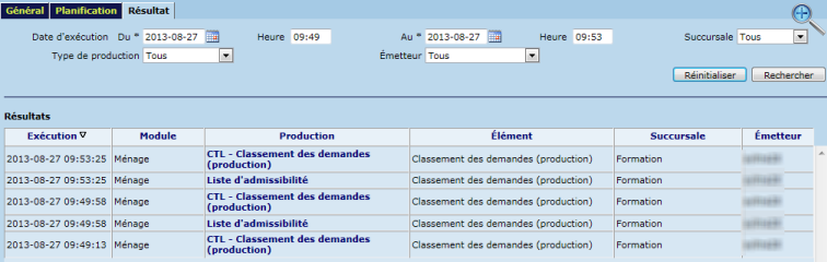 L'onglet "Résultat" affiche la liste des fichiers générés lors des planifications correspondant aux critères de sélection spécifiés au-dessus du tableau "Résultats". Ce dernier affiche la liste des rapports de contrôle (CTL) et les listes d'admissibilité (s'il y lieu).