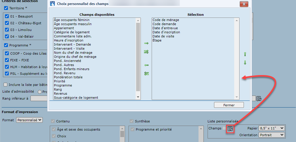 Le format personnalisé permet de définir les champs à afficher dans la liste, et offre ainsi plus de flexibilité. Pour ce faire, il suffit de cliquer sur la liste de valeurs, et déplacer les champs désirés dans la liste des champs disponibles vers la liste "Sélection" à l'aide des flèches prévues à cet effet.