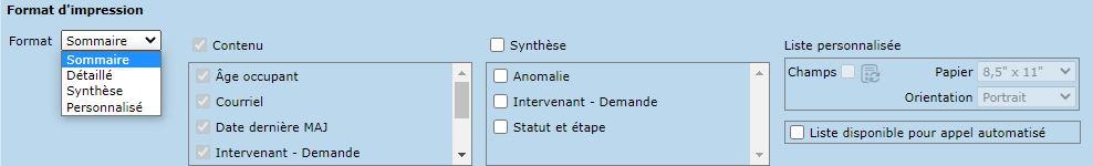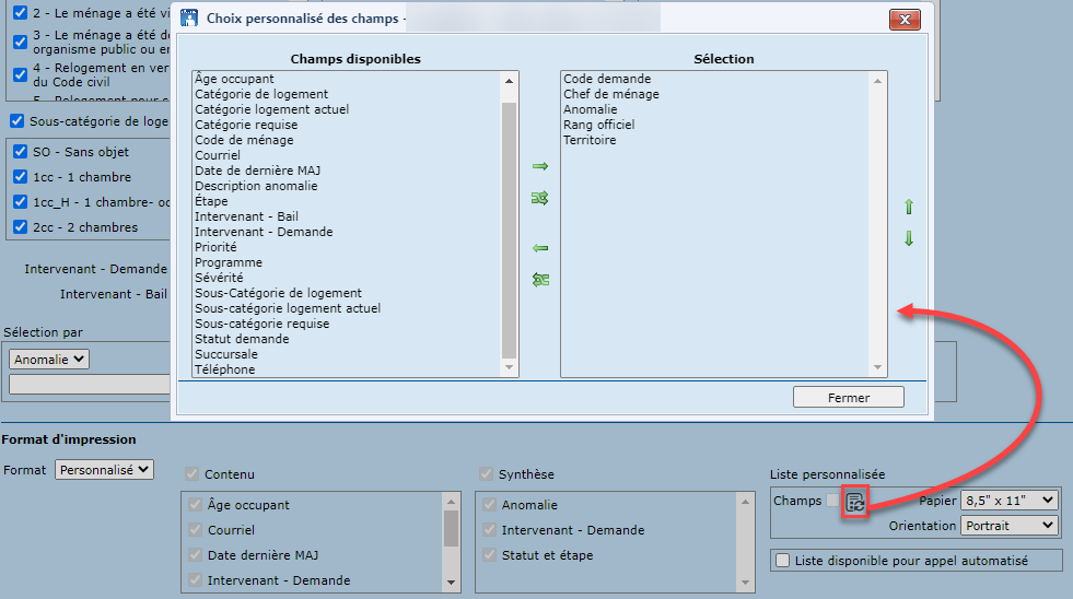 Le format personnalisé permet de définir les champs à afficher dans la liste, et offre ainsi plus de flexibilité. Pour ce faire, il suffit de cliquer sur la liste de valeurs, et déplacer les champs désirés dans la liste des champs disponibles vers la liste "Sélection" à l'aide des flèches prévues à cet effet.