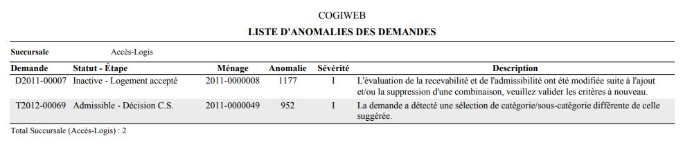 La liste d'anomalies des demandes peut être imprimée en 4 formats :