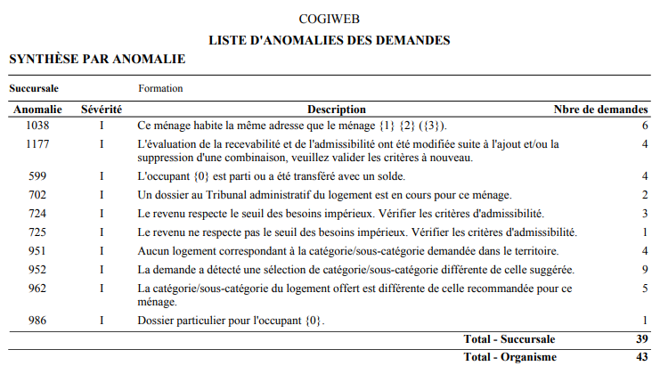 Le format synthèse présente un résumé des informations selon des critères précis. La liste d'anomalies des demandes permet de choisir les synthèses suivantes :