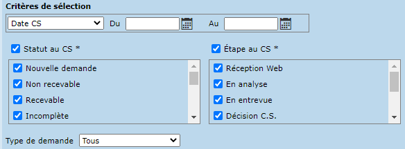 La liste des comités de sélection permet de spécifier les critères suivants :