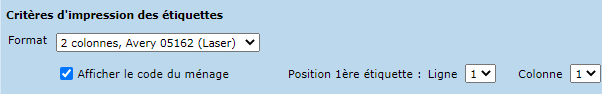 Pour générer une série d'étiquettes en fonction des critères de recherche sélectionnés, il suffit de cliquer sur le bouton "Étiquette". Par ailleurs, il est possible de générer une liste de ménages en fonction des critères de recherche sélectionnés en cliquant sur le bouton "Imprimer".