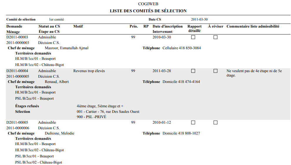 Le format détaillé fournit les informations de base et des informations complémentaires pour chaque comité de sélection. Par ailleurs, le format détaillé permet d'afficher ou non le contenu suivant :