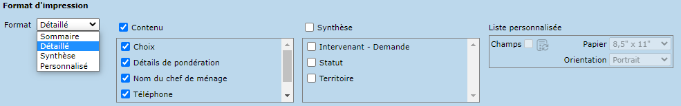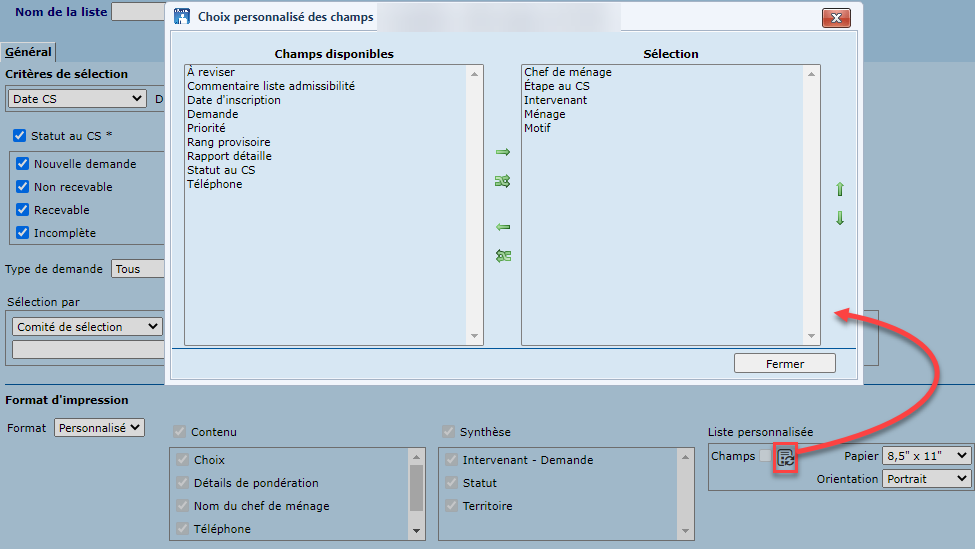 Le format personnalisé permet de définir les champs à afficher dans la liste, et offre ainsi plus de flexibilité. Pour ce faire, il suffit de cliquer sur la liste de valeurs, et déplacer les champs désirés dans la liste des champs disponibles vers la liste "Sélection" à l'aide des flèches prévues à cet effet.