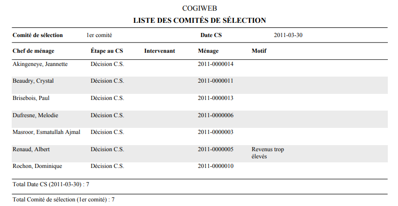 Les formats sommaire et détaillé permettent de regrouper les informations de la liste des comités de sélection selon les critères suivants :