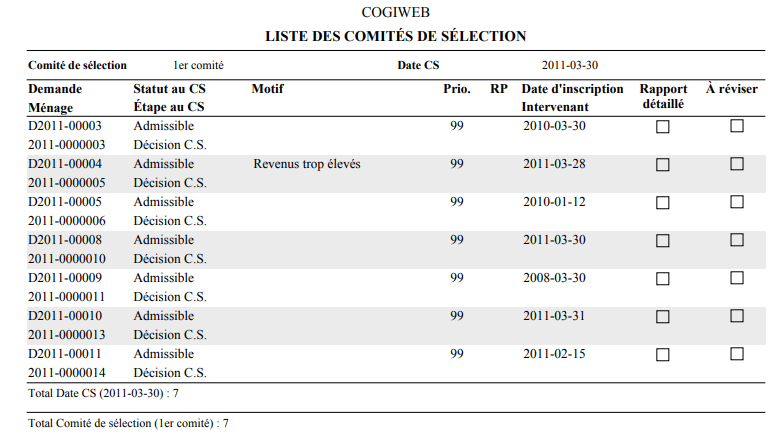 Le format sommaire fournit les informations de base pour chaque comité de sélection.