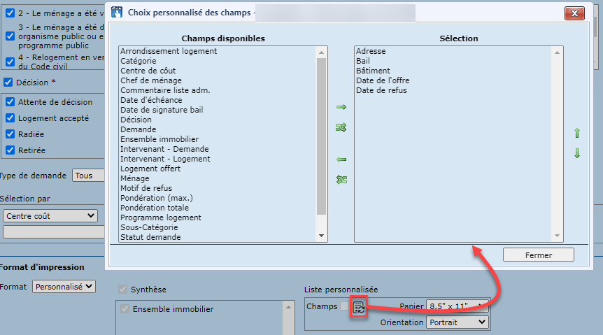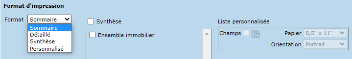 Le format personnalisé permet de définir les champs à afficher dans la liste, et offre ainsi plus de flexibilité. Pour ce faire, il suffit de cliquer sur la liste de valeurs, et déplacer les champs désirés dans la liste des champs disponibles vers la liste "Sélection" à l'aide des flèches prévues à cet effet.