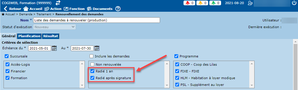 Cocher les cases permettant d'inclure les demandes "Radié 1 an" et "Radié après signature" si votre organisme souhaite que ces demandes reviennent sur la liste d'admissibilité lorsque la durée de la radiation est complétée.