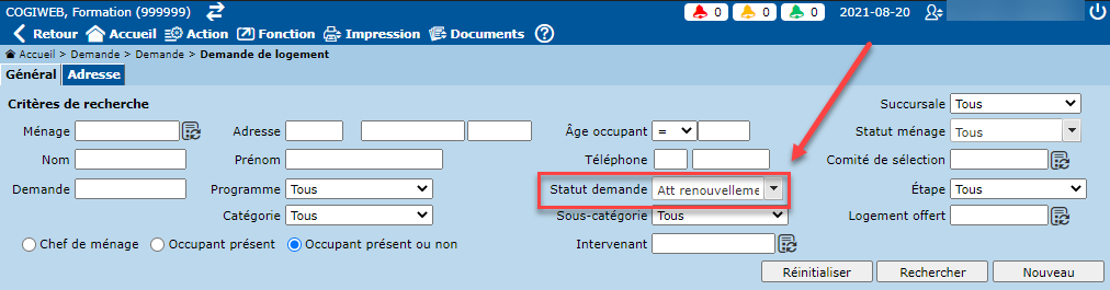 Le statut "Att. renouvellement" identifie les demandes n'ayant pas encore été renouvelées lorsque la date de renouvellement est atteinte. La demande demeure à ce statut pour un nombre de jours pilotable par l'organisme. Les demandes ayant ce statut ne se trouvent plus dans la liste d'admissibilité.