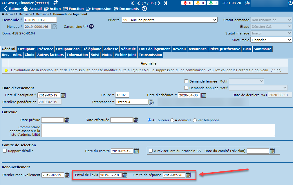 Une fois le traitement effectué, la date d'envoi de l'avis ainsi que la date limite de réponse seront inscrites dans la section "Renouvellement" sous l'onglet "Général" de chacune des demandes concernées.
