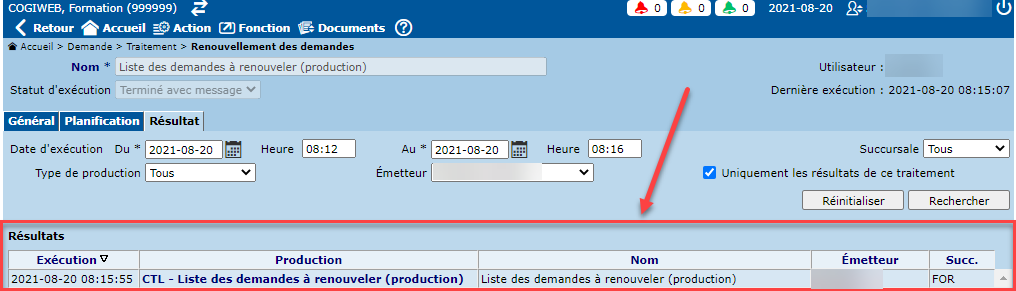 La liste des demandes à renouveler et les correspondances se trouvent sous l'onglet "Résultat".