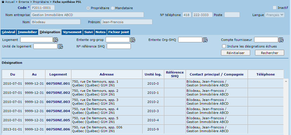 L'onglet "Désignation" présente les informations relatives à la désignation des logements ayant été ou étant associés à l'entente. Les informations présentées incluent l'adresse des logements, leur numéro de référence SHQ et les coordonnées du contact principal.