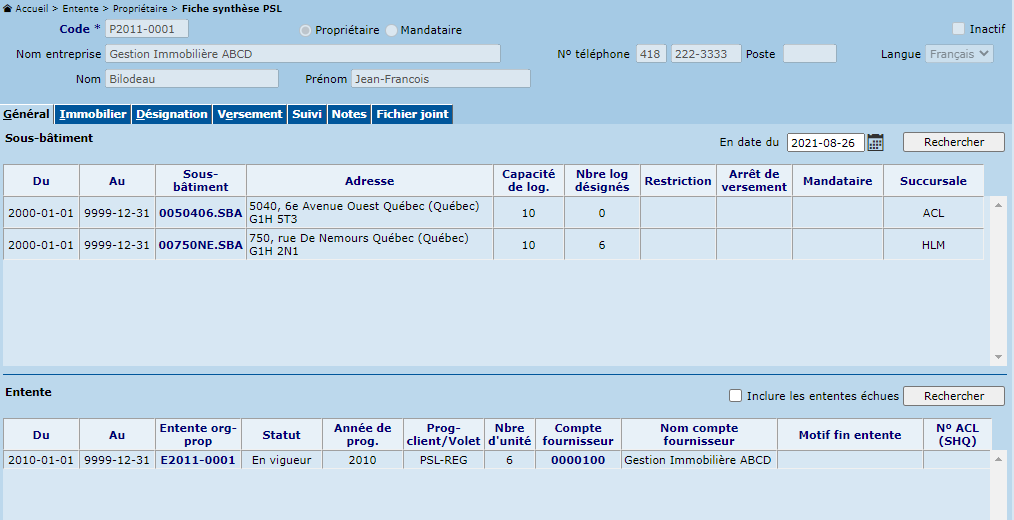 L'onglet "Général" présente la liste des sous-bâtiments et des ententes associés au propriétaire. L'hyperlien sur le numéro de sous-bâtiment amène à l'onglet "Immobilier", alors que le lien sur le numéro d'entente amène à l'onglet "Désignation".