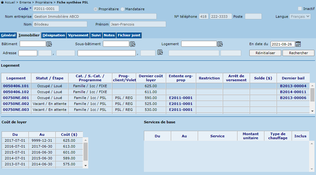 L'onglet "Immobilier" présente la liste des logements associés au propriétaire, de même que les coûts de loyer et la liste des services de base associés aux logements.