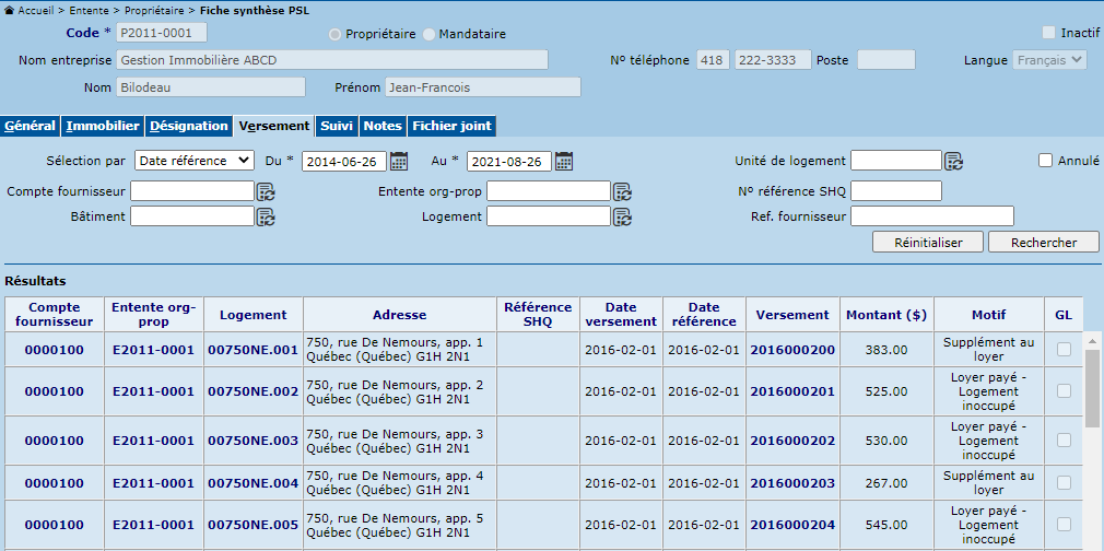 L'onglet "Versement" présente la liste des versements effectués au propriétaire.