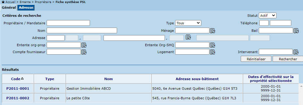 Il est possible de rechercher une fiche synthèse PSL selon différents critères sous "Entente -> Propriétaire -> Fiche synthèse PSL". L'onglet "Adresse" permet de rechercher une fiche synthèse PSL selon les informations relatives à une adresse (recherche par code postal, par rue, par territoire, etc.).