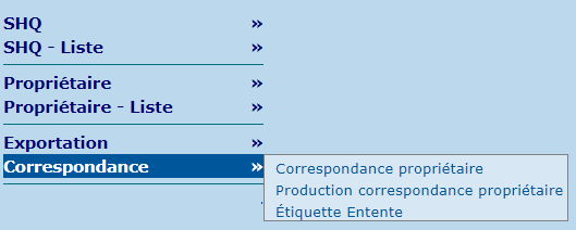 La section "Correspondance" contient une série d'écrans permettant de produire des correspondances concernant les ententes organisme / propriétaire et destinées aux propriétaires.