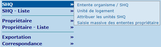 La section "SHQ" contient les écrans permettant de gérer les aspects touchant les ententes entre l'organisme et la SHQ.