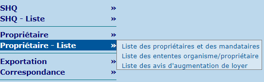 | Liste des ententes organisme / propriétaire | Permet de créer des listes d'ententes conclues entre l'organisme et des propriétaires privés, selon différents critères. |