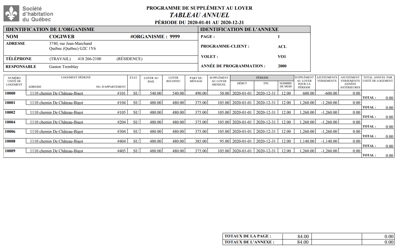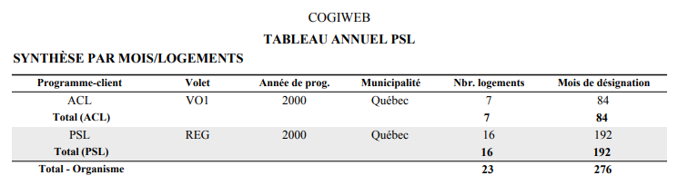 L'écran "Tableau annuel (rapport)" permet de produire le tableau annuel PSL devant être annexé aux états financiers de l'organisme. Ce tableau comprend, pour chaque unité de logement, les subventions versées pour l'année financière sélectionnée, en tenant compte de tous les états, soient :