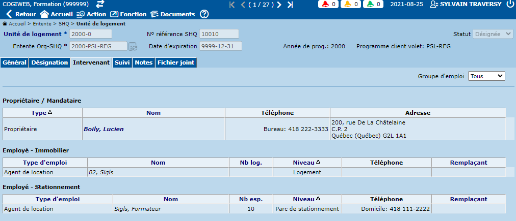 L'onglet "Intervenant" affiche les différents intervenants associés à l'unité de logement.