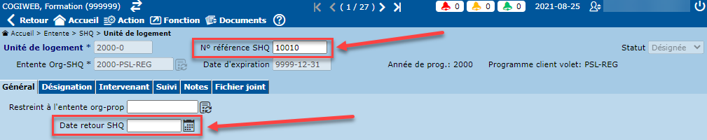 La "Date de retour SHQ" est saisie uniquement lorsque l'unité de logement est retournée à la SHQ. Cette date ne peut être inférieure à la date de fin de la dernière désignation de l'unité.