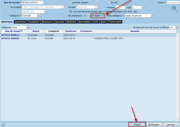 - Le bouton "# appel" permet de comptabiliser le nombre d’appels reçus pour le travail à effectuer sur ce bon de travail.
