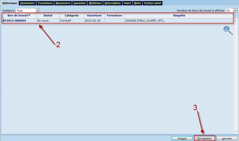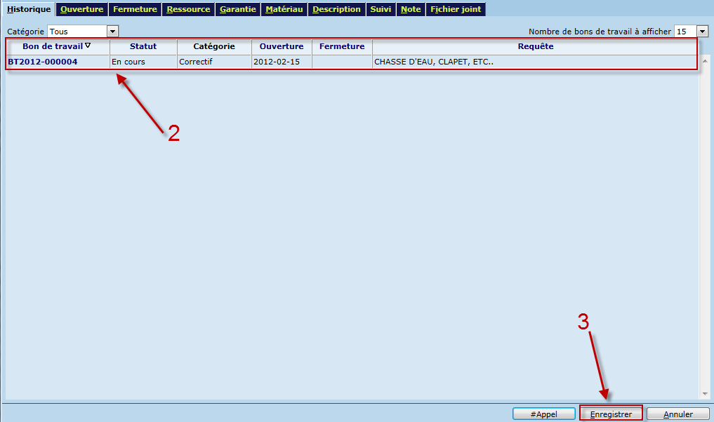 Un numéro de bon de travail sera généré automatiquement lors de l'enregistrement. L’onglet historique affiche tous les bons de travail reliés au composant sélectionné ainsi que leur statut. Il permet de consulter rapidement les travaux effectués sur le composant ainsi que de s’assurer qu’un bon de travail n’est pas déjà ouvert pour le problème en cours.