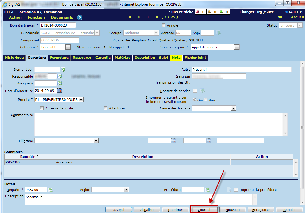 Le "Nb impression" du bon de travail augmente chaque fois que ce dernier est envoyé par courriel. De plus, le statut du bon de travail passe automatiquement à "En cours" dès que l'utilisateur clique sur le bouton "Courriel".