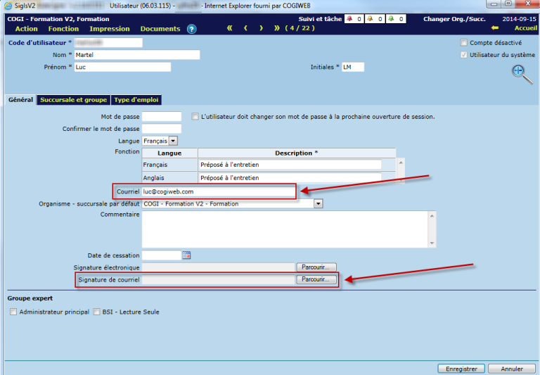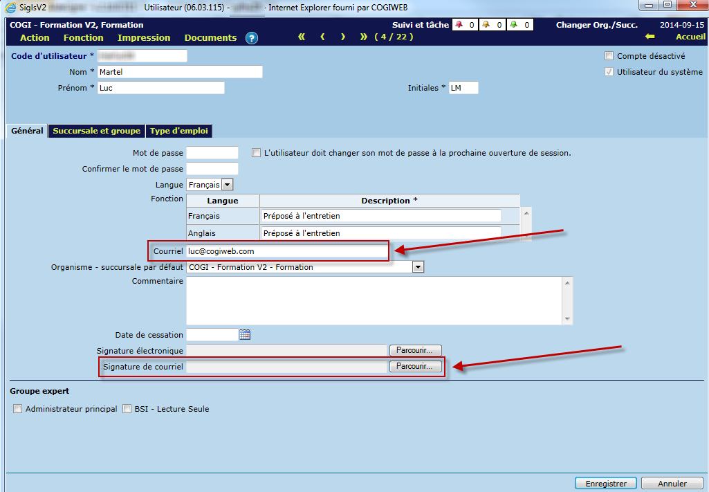L'adresse courriel et la signature de courriel de l'utilisateur peuvent être configurés sous "Administration -> Sécurité -> Utilisateur".