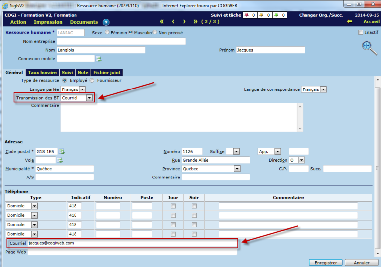 L'adresse courriel de chaque ressource humaine peut être saisie sous "Entretien -> Pilotage - Entretien -> Ressource humaine".