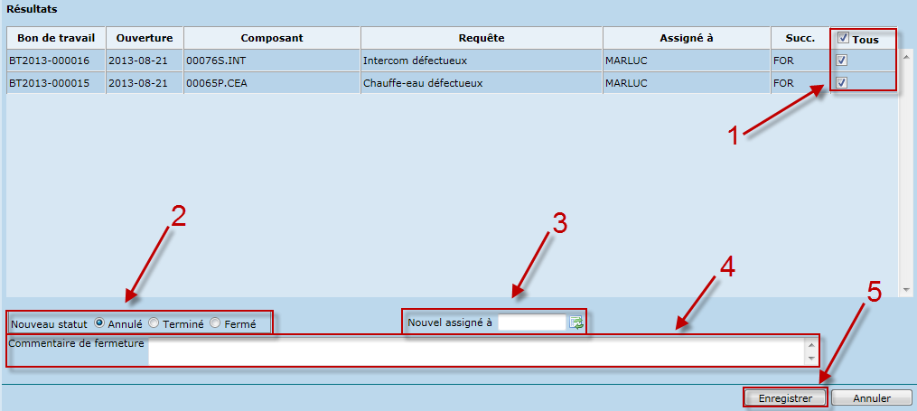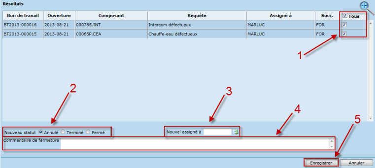 - Sélectionner les bons de travail à fermer ou à assigner à un autre intervenant.