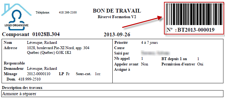 - Capter le code à barres à l'aide d'un lecteur de code à barres. Cette action aura pour effet de saisir automatiquement le numéro du bon de travail dans le champ "Bon de travail.
