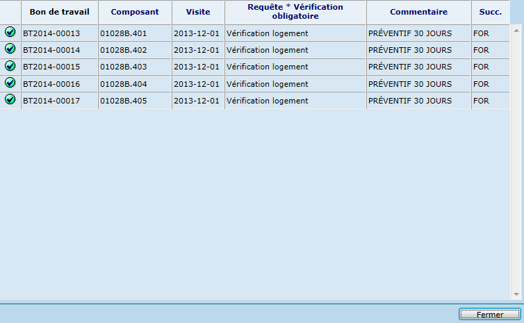 Ce bouton permet de visualiser quel sera l’ordre (la séquence) de création des bons de travail, ainsi que le composant, la requête et sa priorité d’intervention, la date de la visite, et la succursale du composant. Un astérisque ‘*’ indique que la vérification est obligatoire.