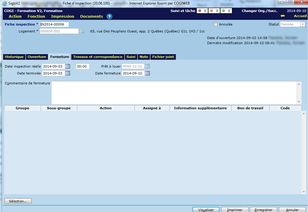 De plus, l'onglet "Ouverture" affiche le bloc préparatoire à l'inspection. La colonne de gauche permet de déterminer les ressources et la date prévue d'inspection, alors que la colonne de droite affiche, en lecture seule, les informations relatives à la dernière résiliation.