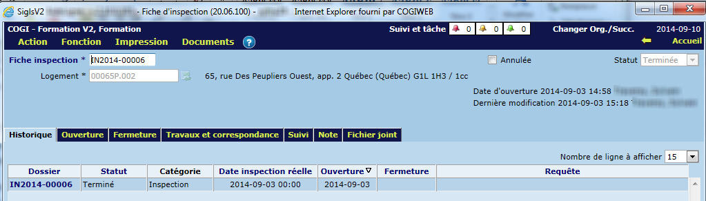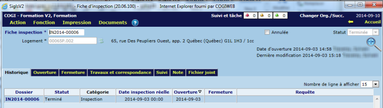 L'onglet "Historique" affiche la liste des inspections ayant eu lieu dans le logement, pour tous les bons de travail associés à ce dernier. Essentiellement, cet onglet offre un portrait des visites effectuées par le personnel d'entretien dans le logement. Par défaut, les inspections sont affichées en ordre décroissant de date d'ouverture.