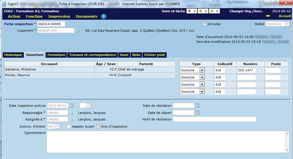 L'onglet "Ouverture" s'apparente à celui du bon de travail. Il affiche des informations sommaires sur les occupants telles que les numéros de téléphone et les notes du ménage.