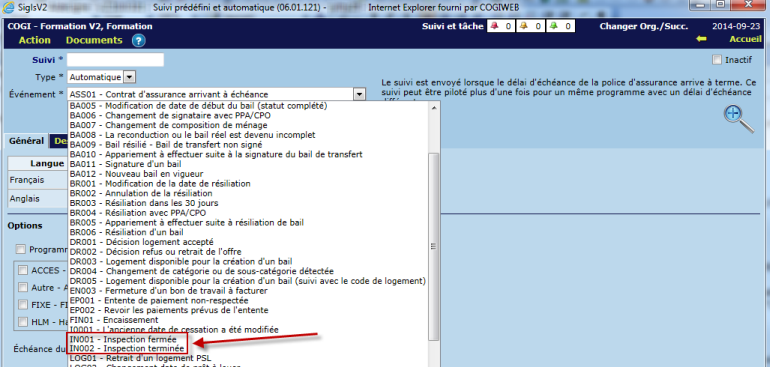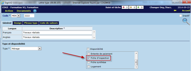 Le menu de l'onglet "Travaux et correspondance" est pilotable. Par conséquent, il est possible de choisir le titre des travaux ainsi que le contenu affiché sur les correspondances. Le pilotage peut être effectué via "Entretien -> Pilotage - Entretien -> Travaux de l'inspection".