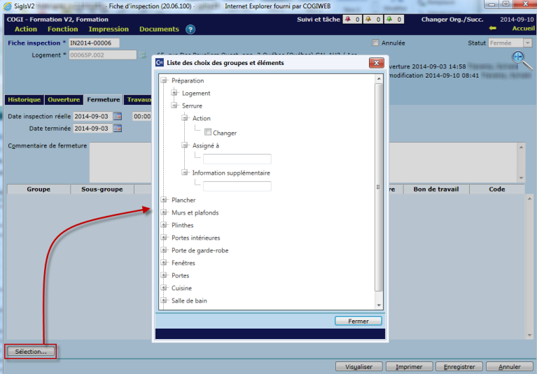 Le bouton "Sélection" permet d'ouvrir une fenêtre dans laquelle il est possible de saisir une fiche d'inspection complétée par un employé. La structure logique de cette saisie est pilotable à partir d'un autre module (voir section "Pilotage" plus bas).