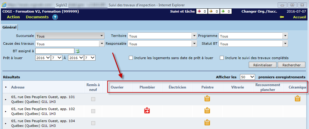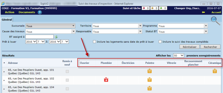 Une fois pilotés, les corps de métier sont visibles dans le tableau des logements de l'écran "Suivi des travaux d'inspection", sous lesquels le statut des bons de travail sont affichés.
