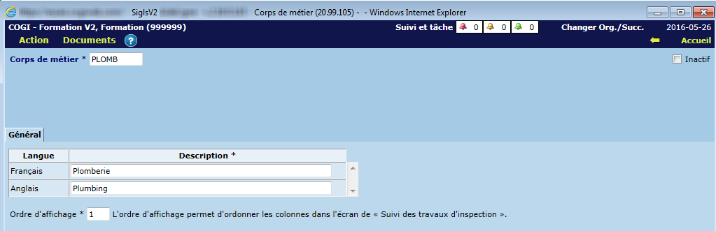 - Spécifier l'ordre d'affichage de la colonne, au niveau de l'écran "Suivi des travaux d'inspection";