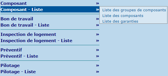 La section "Composant - Liste" contient une série de listes qui concernent les groupes de composants, les composants et les garanties.
