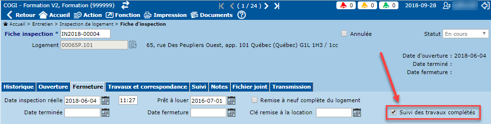 Par ailleurs, il est possible de masquer une fiche d'inspection dans l'écran "Suivi des travaux d'inspection" à l'aide de la case à cocher "Suivi des travaux complétés" sous l'onglet "Fermeture" de l'écran "Fiche d'inspection". Pour masquer la fiche d'inspection, il suffit de laisser cette case décochée.