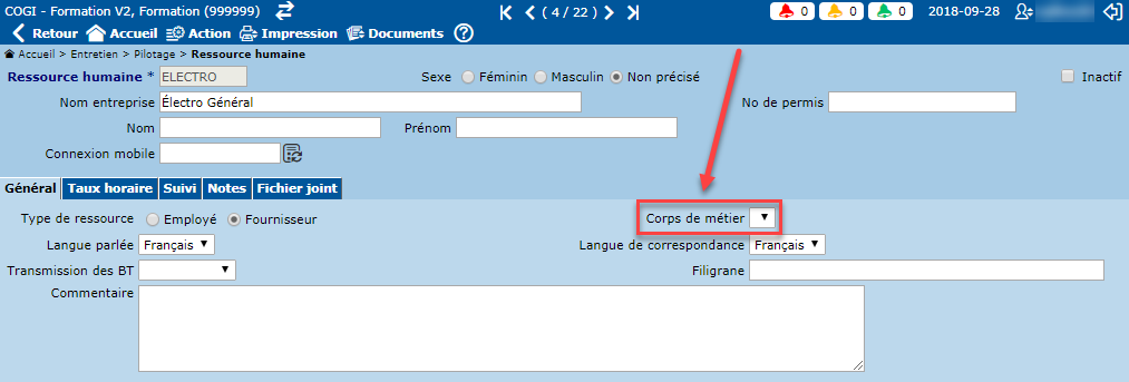 Il est possible d'associer un corps de métier à une ressource humaine, à l'aide de la liste déroulante "Corps de métier" sous l'onglet "Général" de l'écran de pilotage "Ressource humaine". Cette action permet de faire apparaître les bons de travail assignés à cette ressource dans la colonne correspondante du suivi des travaux de l'inspection.