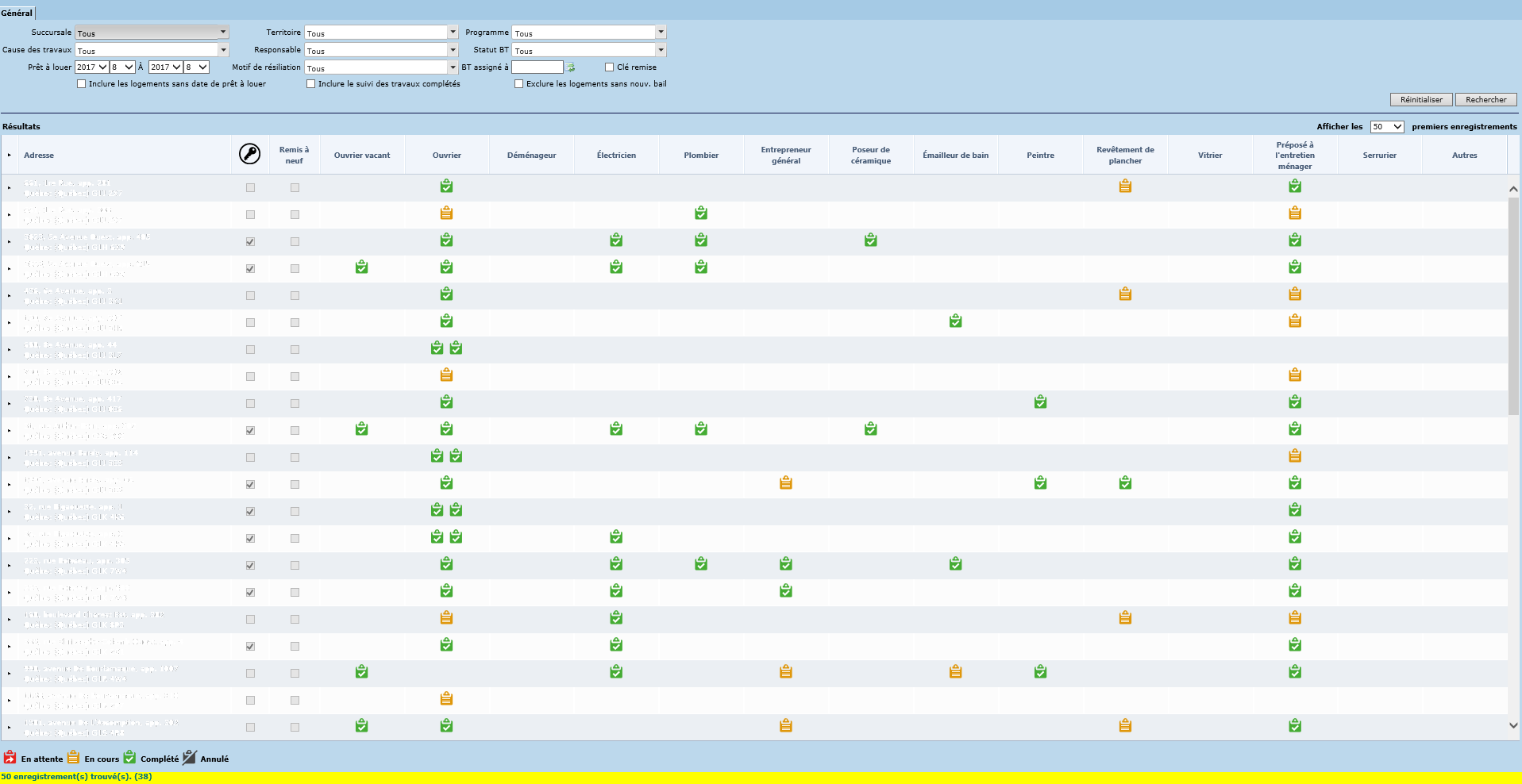 Par ailleurs, le tableau des résultats présente les différents corps de métier pilotés pour l'organisme (p. ex. : plombier, électricien, etc.). Des pictogrammes représentant le statut des bons de travail sont affichés, s'il y a lieu, sur la ligne du logement concerné, dans la colonne du corps de métier concerné. La légende pour ces pictogrammes est disponible dans la partie inférieure gauche de l’écran. Ces pictogrammes permettent de naviguer vers le bon de travail concerné par l'entremise d'un hyperlien. Par ailleurs, au survol de la souris sur un de ces pictogrammes, une infobulle s'affiche et présente les informations suivantes :