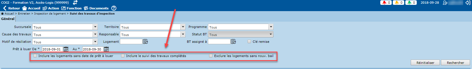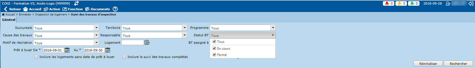 L'en-tête de cet écran permet d'effectuer le suivi des travaux d'inspection selon différents critères. Il est à noter que les listes déroulantes disponibles dans l'en-tête permettent la sélection multiple de statuts à l'aide de cases à cocher.