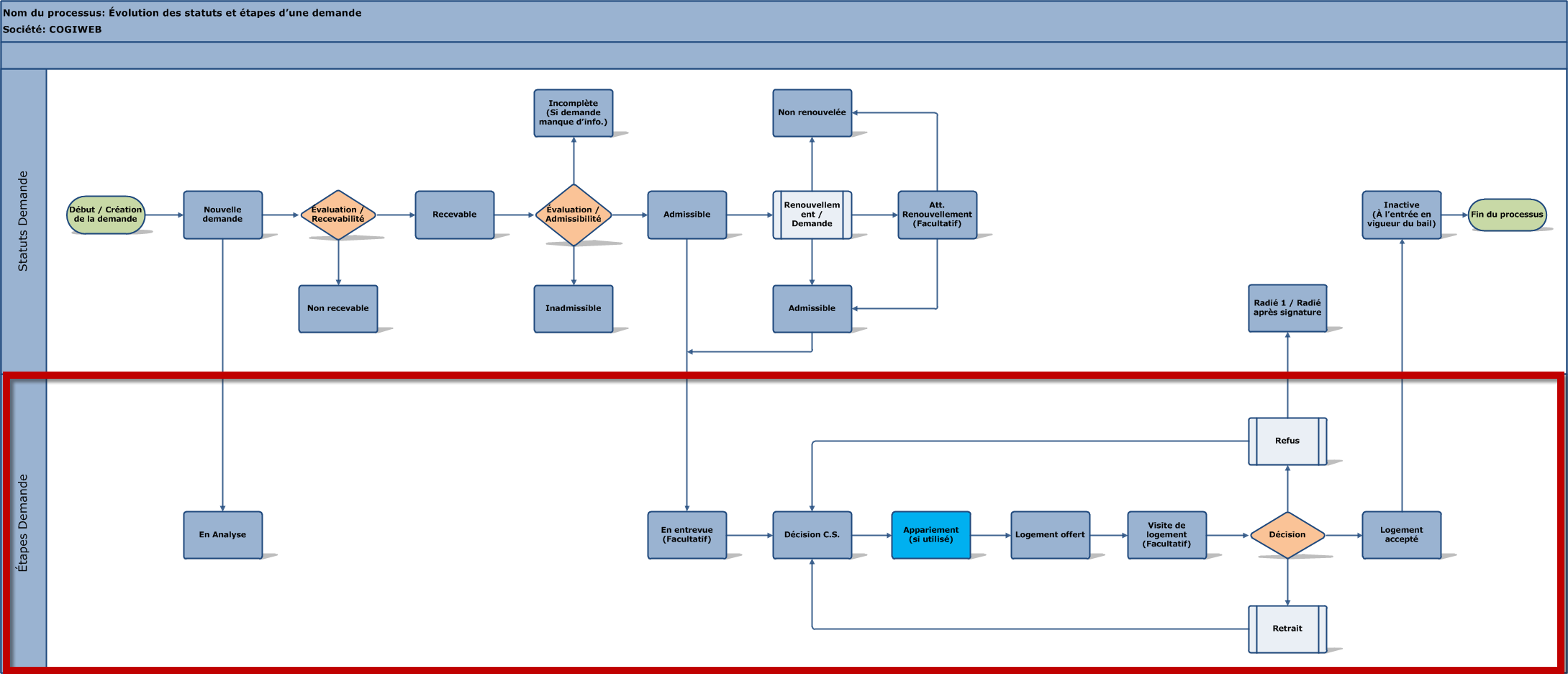 L'encadré rouge dans le diagramme ci-dessous présente les différentes étapes d'une demande de logement :