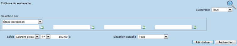 L'écran "Changement massif des étapes de perception" permet de changer l'étape de perception d'un ou plusieurs comptes clients simultanément.