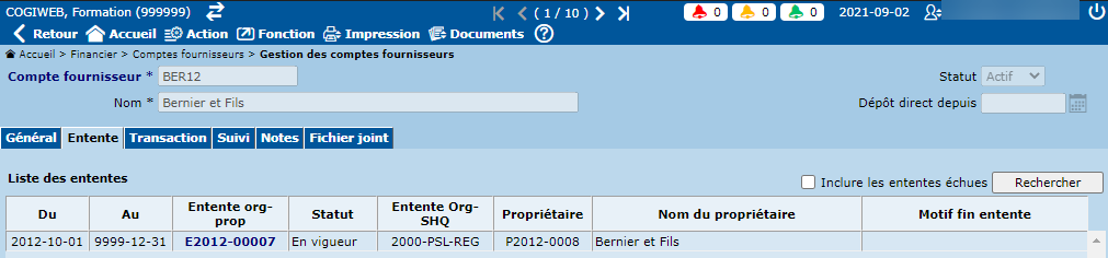 L'onglet "Entente" présente la liste des ententes "Organisme/SHQ" ou "Organisme/Propriétaire" conclues avec le fournisseur, selon le cas.